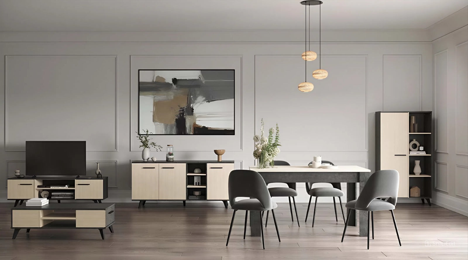 Buffet + Vitrine + Table à manger extensible + Table basse + Meuble TV